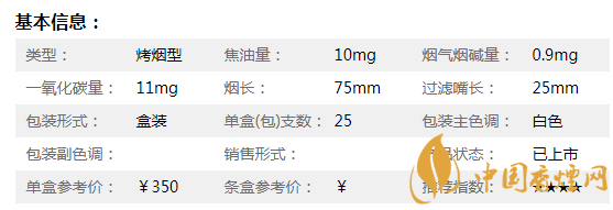 | 煙長(zhǎng):84mm | 過(guò)濾嘴長(zhǎng):25mm | 包裝形式:條盒硬盒 | 單盒(包)支數(shù):20 |