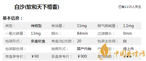 | 類型 :烤煙型 | 焦油量 :11mg | 煙氣煙堿量 :1mg | 一氧化碳量 :13mg |