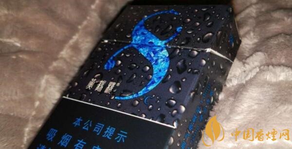 這款香煙正面外觀來看給人的第一印象它就是一款涼煙,炫酷純黑的底色搭配晶亮水滴為主色調,同時冰藍顏色的抽象冰塊圖案形成了一個數(shù)字“8”形狀,讓人覺得涼爽的同時也突出了產品LOGO。