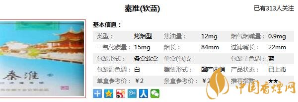 秦淮香煙系江蘇中煙出品,烤煙型香煙,由于種種原因,現(xiàn)如今這個(gè)品牌的香煙已經(jīng)退出市場(chǎng)了,先如今留給后人的只有懷念,這也是中國(guó)煙草市場(chǎng)不變的定律,那么在對(duì)秦淮香煙價(jià)格表進(jìn)行介紹之前,先來(lái)看一看這款秦淮煙多少錢(qián)一包,這款秦淮(軟藍(lán))的售價(jià)為2元/包。