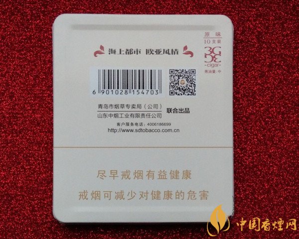 泰山(3G原味)采用3D鐵盒裝置,以青島五四廣場(chǎng)的建筑性標(biāo)志為主圖背景,突出青島這座海山都市獨(dú)有的文化底蘊(yùn)。它的焦含量中等,煙香馥郁芬芳中夾帶著些許的甜潤(rùn)感,吸味醇正細(xì)膩,簡(jiǎn)約而時(shí)尚個(gè)性的外觀,深受時(shí)尚界煙客的喜愛(ài)。為了對(duì)這款泰山雪茄型香煙價(jià)格有一個(gè)詳細(xì)的了解,先來(lái)看看這款泰山雪茄多少錢一盒?據(jù)小編調(diào)查得知市場(chǎng)售價(jià)為25元/包。