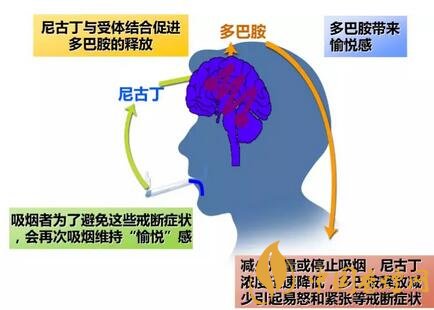 尼古丁在體內(nèi)代謝速度非常快,不抽煙的時(shí)候,尼古丁濃度的迅速降低造成多巴胺釋放量減少,因而產(chǎn)生煩躁、焦慮等戒斷癥狀,身體就會(huì)渴求再次吸煙以獲得尼古丁來(lái)避免戒斷癥狀,這就是尼古丁成癮的本質(zhì)。