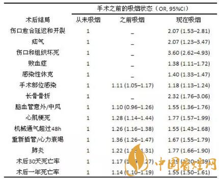 吸煙也是引起圍術(shù)期多數(shù)并發(fā)癥的重要因素。下表為相較于從未吸煙的患者,之前吸煙(即術(shù)前戒煙)和現(xiàn)在吸煙的患者發(fā)病的風(fēng)險(xiǎn):