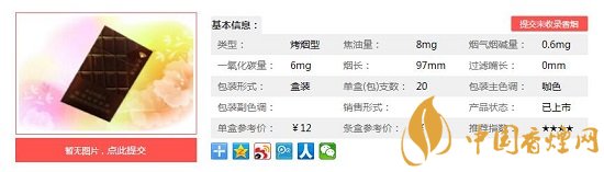 | 類型 :烤煙型 | 焦油量 :8mg | 煙氣煙堿量 :0.6mg | 一氧化碳量 :6mg |