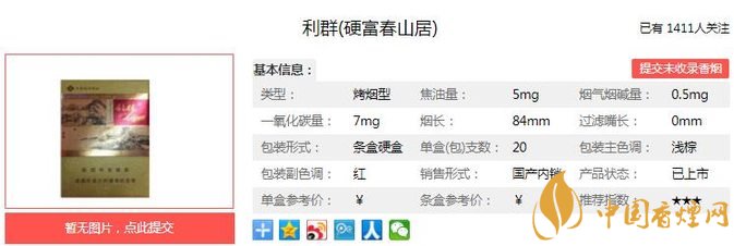 利群硬富春山居煙支長(zhǎng)84mm,過(guò)濾嘴長(zhǎng)不詳,杭州富春江畔之自然人文氣韻產(chǎn)品采用浙江新昌稀有香料煙葉配方調(diào)制,以多門獨(dú)有技術(shù)實(shí)現(xiàn)不加香不加料富春山居利群:純煙葉打造 華夏第一支。下面我們一起來(lái)看利群硬富春山居的參數(shù)信息:焦油量:5mg 煙堿量:0.5mg 一氧化碳量:7mg