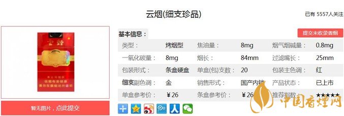 云煙細(xì)支珍品依托云南最好的煙葉品質(zhì),傳遞自然生香。云南優(yōu)越的自然環(huán)境培育出國內(nèi)最優(yōu)質(zhì)煙葉品種之一的“紅花大金元”,入選“金腰帶”主配方。經(jīng)香煙網(wǎng)小編市場調(diào)查云煙細(xì)支珍品售價為26元/包。