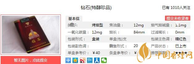 鉆石特醇珍品煙支長(zhǎng)84mm,選用了高透氣度高強(qiáng)度的奧地利盤紙和過濾效率高的醋酸咀棒,運(yùn)用新技術(shù),加長(zhǎng)了濾咀,使卷煙的焦油等成份得到更加有效的截留,加工工藝先進(jìn),裝璜設(shè)計(jì)清新爽目,顯示產(chǎn)品的高檔。下面我們一起來看鉆石特醇珍品的參數(shù)信息:焦油量:12mg 煙堿量:1.1mg 一氧化碳量:12mg