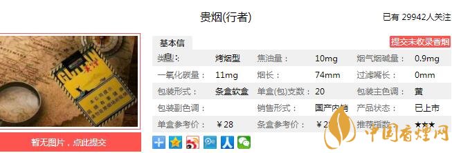 “貴煙(行者)”是“貴煙”旗下的首款短支爆珠煙。煙香不濃不淡,煙草的清香味道,醇正而清新。黃黑配色的醒目包裝、斜條紋帶來的西部公路感,都在把人引到一種豪放、自由的感覺之中。經(jīng)香煙網(wǎng)小編市場(chǎng)調(diào)查貴煙行者售價(jià)為28元/包。