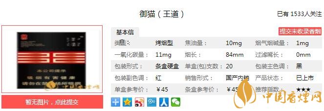成熟、渾厚、自然的煙草本香結(jié)合甜香韻、果香韻、花香韻和酒香韻,協(xié)調(diào)統(tǒng)一,自然天成。煙香成熟、優(yōu)雅、厚實(shí)、純凈、細(xì)膩、豐富;吃味飽滿、純凈、自然;回味津潤、回甜、舒適、干凈。經(jīng)香煙網(wǎng)小編市場調(diào)查御貓王道售價為45元/包。
