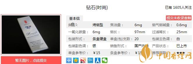 精選自然醇化的云、貴、湘、閩煙葉,調(diào)配進(jìn)口優(yōu)質(zhì)煙葉,精心研制獨(dú)特配方,使得直徑5.4mm極致細(xì)支煙,仍能透發(fā)出煙香純正飽滿,濃郁醇厚;激光打孔科技,結(jié)合獨(dú)特加工工藝,使煙草天然本香自然釋放,香氣流暢濃郁。經(jīng)香煙網(wǎng)小編市場(chǎng)調(diào)查鉆石時(shí)尚售價(jià)為15元/包。