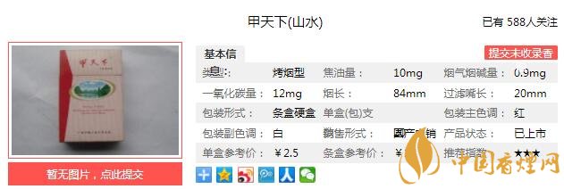 以上便是由香煙網(wǎng)小編為大家介紹的關于甲天下山水香煙怎么樣 甲天下山水價格及口感介紹的相關信息,想要了解更多有關內(nèi)容請點擊:黃金葉茗仕之風口感分析 黃金葉茗仕之風價格及參數(shù)介紹