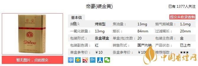 帝豪(硬金黃)采用優(yōu)質(zhì)上等煙葉為主要原料,經(jīng)科學的成分搭配,博取精華,通過現(xiàn)代化加工工藝精制而成。具有醇厚的陳化烤煙的自然香氣,香氣宜人,香韻豐滿,嗅香甘甜舒適。煙氣清雅細膩,入喉飽滿和順,余味干凈舒適,回味清甜持久。具有合理協(xié)調(diào)的理化特征。經(jīng)香煙網(wǎng)小編市場調(diào)查帝豪硬金黃售價為10元/包。
