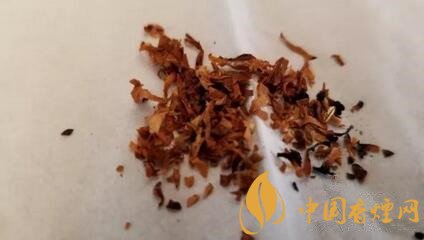 煙絲從外觀上檢視,由棕黃和明黃煙絲組成,品級不錯(cuò)。煙絲切寬1mm左右。間雜切成細(xì)小圓片裝的煙梗。用料還是比較考究的。