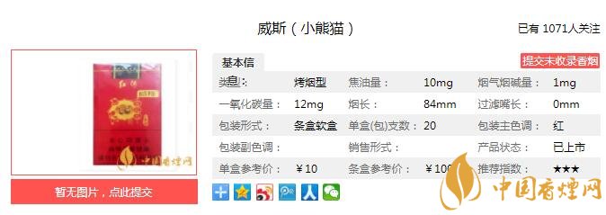 威斯小熊貓的前身是紅河小熊貓世紀(jì)風(fēng),紅河小熊貓世紀(jì)風(fēng)的前身是小熊貓軟紅世紀(jì)風(fēng)。品牌是一變?cè)僮儯藲鈪s一降再降,現(xiàn)在也是風(fēng)光不在了。經(jīng)香煙網(wǎng)小編市場(chǎng)調(diào)查威斯小熊貓售價(jià)為10元/包。