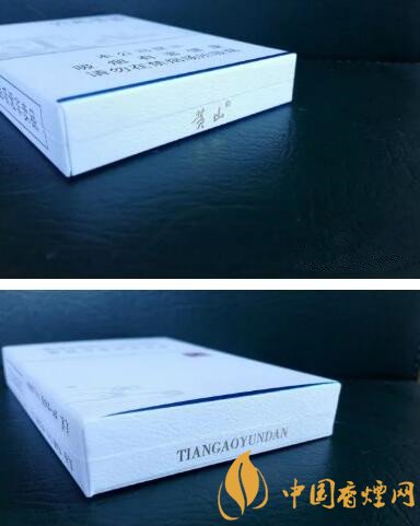 煙盒整體色調(diào)以乳白色為主,上下兩端修飾以天藍(lán)色澤為輔。細(xì)觀白色基調(diào)的畫面上,印制的是黃山經(jīng)典的風(fēng)景,迎客松與云霧。