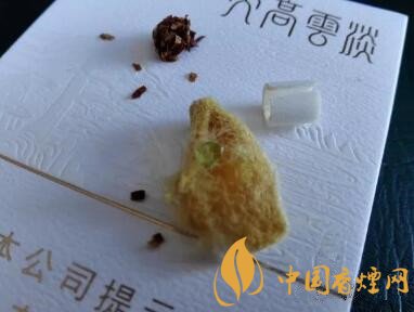 一小段材質(zhì)較硬的過濾嘴。海綿體內(nèi)包裹著的,是一顆淡綠色的香珠。同時(shí),過濾嘴紙張內(nèi),附著一層黃色的紙張??傊?,過濾嘴里內(nèi)容豐富的很。