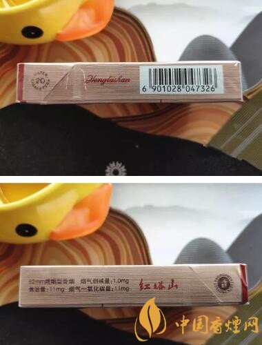 頂部除了紅色的紅塔山字樣外,多了一行“中國(guó)稅收未繳專供出口”,明顯的提示這是一款專供出口的香煙;底部是一處銀色反光的貼紙,一定角度下可以看到貼紙里有紅塔山的圖案。