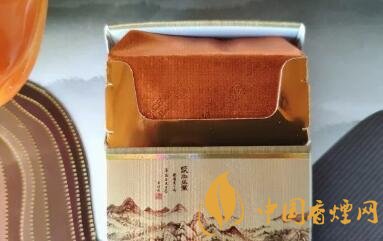 在煙盒處的腰間,一條金色的絲帶環(huán)繞整個(gè)煙盒。中央的水墨山水畫(huà)很是素雅,在畫(huà)中還有一段詩(shī)句,古香氣息彌漫。下半部的本公司提示不多贅述。