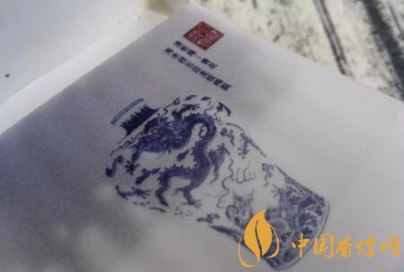 先來欣賞一下煙盒內(nèi)里的包裝設(shè)計(jì)特點(diǎn)。向上掀開合蓋,會發(fā)現(xiàn)上蓋內(nèi)里印有數(shù)條騰龍圖案,以及china瓷字樣。