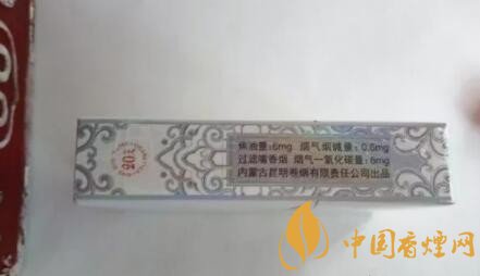 煙盒的左側(cè)是理化指標(biāo),寫在一種銀色的花紋勾勒的邊框內(nèi),焦油量:6mg,煙氣煙堿量:0.6mg,煙氣一氧化碳量:8mg和內(nèi)蒙古昆明出品等字樣。