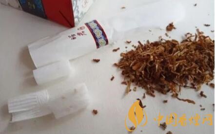 拆開一支看到煙絲非常的碎,而且也不是很整齊,煙嘴分為兩段,上面一段外面是這樣褶皺的紙包裹著,形成了看到的溝槽式濾嘴,而且在棉花里可以看到一些顆粒。