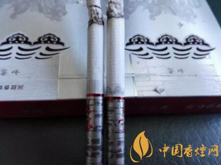 “隨溫而變,忽隱忽現”。兩款版本的煙盒側面,均印制上了這8個字。具體指的,就是在吸食過程中,如果微用力濃吸煙霧,煙支水松紙上的紋飾圖案顏色,會由深變淺,直至消失不見。而過了一會兒,圖案顏色又會如初般地顯現出來。