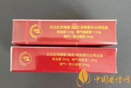 翻轉(zhuǎn)至煙盒的左側(cè),都是生產(chǎn)廠商的名稱和這款香煙的理化含量標(biāo)識。廠家同為“紅云紅河煙草(集團)有限責(zé)任公司”。