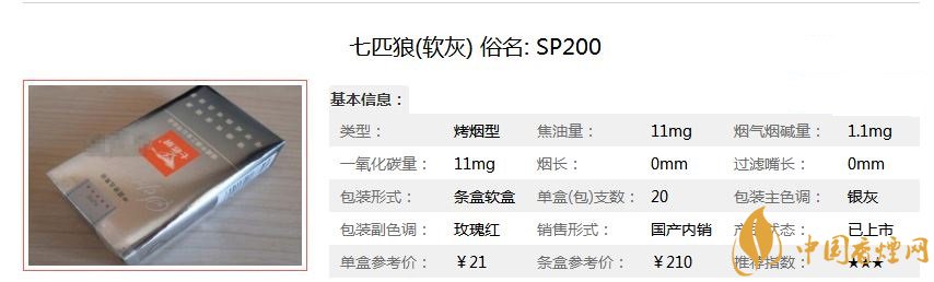七匹狼軟灰亦稱七匹狼(SP200),精選國內外優(yōu)質烤煙,人工片選精華,運用國際先進的無氟及過濾技術、HXD烘絲工藝,由全新的國際一流廠房和設備精工制作,氣質卓越優(yōu)雅,品味自然純正,煙草本香流露無遺,是比較經(jīng)典的具有較高性價比的狼煙。經(jīng)香煙網(wǎng)小編市場調查七匹狼軟灰售價為21元/包。