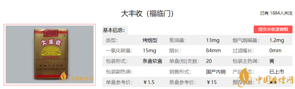 青“大豐收”為中國第一個卷煙共享品牌,是隸屬于中國煙草總公司的卷煙商標,制煙工藝經(jīng)典純正,致力于找尋卷煙最原始自然的口感,化繁為簡,不加香精香料,品出煙草本真的味道。下面便是大豐收(福臨門)的基本參數(shù):煙支長度:84mm 焦油量:13mg 煙氣煙堿量:1.2mg 煙氣一氧化碳量:15mg.