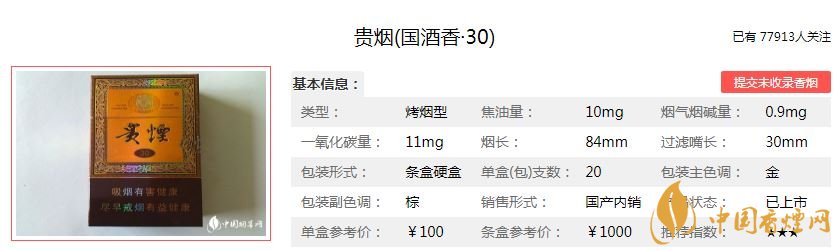 貴煙國(guó)酒香30香煙100元/包,這款煙的焦油量:10mg,煙堿量:0.9mg,一氧化碳量:11mg,這款煙抽起來(lái)有茅臺(tái)酒的酒香味和煙草的香味,順口,綿而不淡,香而不膩