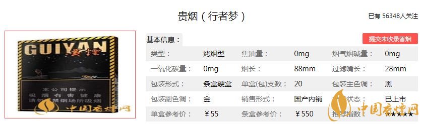 貴煙(行者夢(mèng))香煙55元/包,也是2019年新推出的產(chǎn)品,焦油量:9mg,煙堿量:0.9mg,一氧化碳量:8mg,外包裝經(jīng)典大氣。