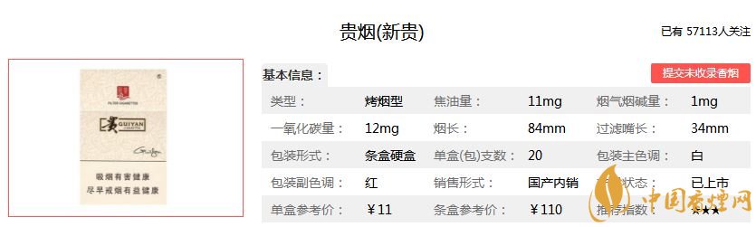 貴煙新貴香煙11元/包,這款煙的焦油含量是11mg,煙氣煙堿含量1.0mg,煙氣一氧化碳含量是12mg,售價(jià)適中,深受煙民最愛(ài),口味清爽,煙勁道足。