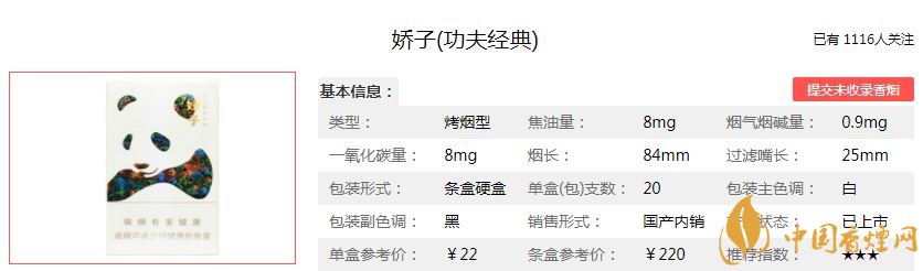 嬌子香煙是四川出名的香煙品牌,許多人對這款香煙印象深刻,因?yàn)樗臒熀猩嫌≈覀儑业膰鴮?,大熊貓。今天為大家介紹一款嬌子功夫經(jīng)典香煙。下面是嬌子功夫經(jīng)典香煙的價(jià)格及口感分析的相關(guān)內(nèi)容,快和小編一起了解一下這款香煙吧!