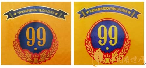 真品卷煙:1.商標(biāo)LOGO稻穗圖案凸起,整體立體、飽滿,大豐收。2.99數(shù)字筆畫圓潤、飽滿,下面圓點尤為突出。3. 藍(lán)色底紋顏色重,邊緣向中間色彩過渡自然。4.商標(biāo)紙流水紋路清晰可見。
