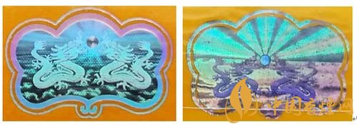 假冒卷煙:該款假冒卷煙雙龍戲珠激光全息防偽,龍圖案模糊,珠子呈現(xiàn)圓形,底紋無點狀痕跡,整體圖案粗糙。如圖左真右假
