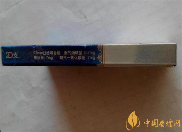 煙盒右側(cè)標(biāo)注著香煙的理化數(shù)值,標(biāo)注著過(guò)濾嘴香煙長(zhǎng)97mm,0.7mg煙氣煙堿量,7mg焦油量,7mg煙氣一氧化碳量,印有主品牌單位名稱,數(shù)量指標(biāo)20支。