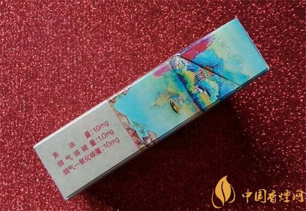 盒右側(cè)標(biāo)注著明確的理化值,1.0mg煙氣煙堿量,10mg焦油量,10mg煙氣一氧化碳量,上端印有夢(mèng)幻般的江南風(fēng)景圖案,風(fēng)格獨(dú)特,特別的討喜,以年輕人的審美觀來(lái)看,非常有檔次和個(gè)性,有一種獨(dú)特的韻味。