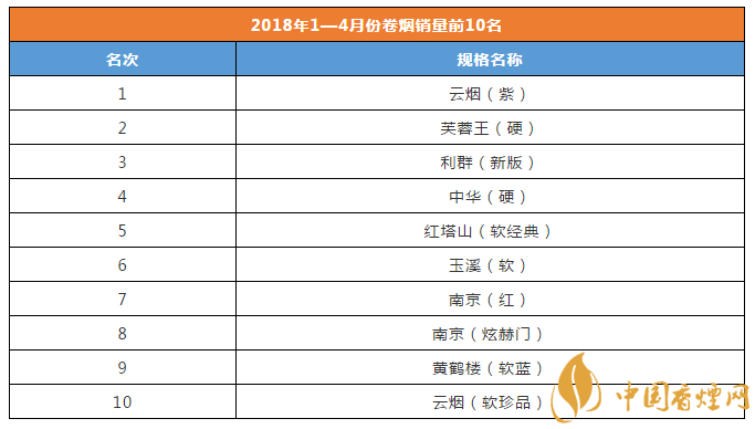 2018年1-4月份卷煙銷量前10名 高三類大單品云煙(紫)銷量最高