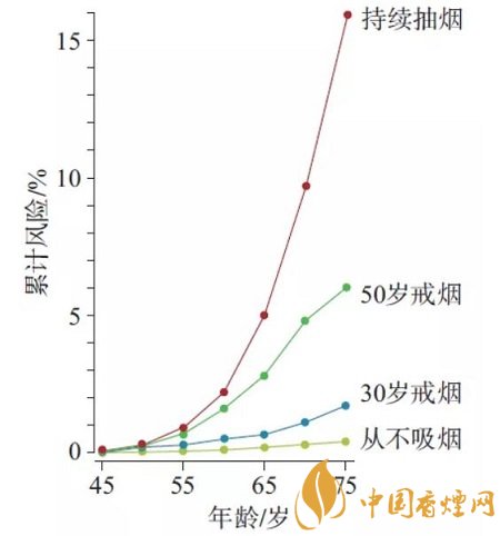 2004 年,著名的《英國癌癥雜志》 發(fā)表了經(jīng)典論文,詳細(xì)統(tǒng)計(jì)了英國等歐洲國家不同群體男性的肺癌死亡率。從圖上不難看出,75歲吸煙人群死于肺癌的概率是16%,比不吸煙人群高了將近50倍。換算一下,也就是說6個(gè)吸煙的人里面會(huì)有1位75歲之前就死于肺癌。更可怕的是,如果每天吸煙量超過5支,那么4個(gè)人里,就會(huì)有1位死于肺癌。