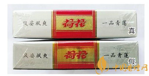 真煙“荷花”字體邊的燙金底部呈網(wǎng)格狀;假煙“荷花”字體邊的燙金底部呈豎線條狀。