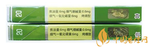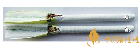 真煙過濾嘴中的綠色香線較細,顏色也較淡,卷煙紙上線條呈網(wǎng)格狀;假煙過濾嘴中的綠色香線較粗,顏色也較深,卷煙紙上線條為橫螺紋。