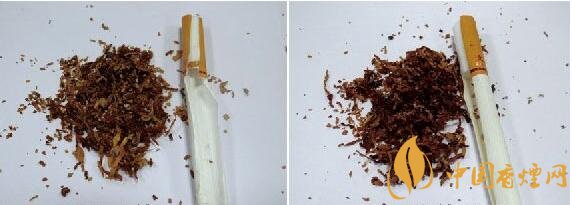 真品煙絲均是從醇化好的“紅花大金元”煙葉中手工甄選出千分之一,成為“云煙(軟大重九)”的主原料,從源頭到工藝的“四級調(diào)香”體系,形成了獨具特色的津甜香,切絲寬度均勻一致且無其他雜質(zhì);假煙從原料到煙絲結(jié)構(gòu)均無法達(dá)到真品煙絲成色及摻配比例,假煙煙絲雜質(zhì)較多,與真品煙絲結(jié)構(gòu)存在明顯差異。(左真右假)