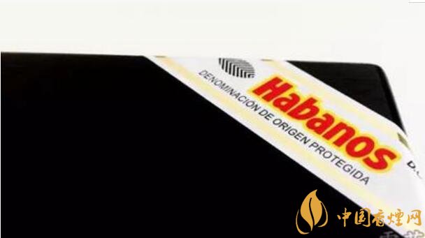 紅色粗體的“Habanos”被黃色描邊加亮,左邊是黑色條紋的煙草葉圖案,頂端和底部是二條金色的粗線條,在標(biāo)簽底部印有DENMOINACION DE ORIGEN PROTEGIDA字樣,代表受保護(hù)的原產(chǎn)地名稱。在標(biāo)簽的右上角還有一個(gè)D.O.P.,是原產(chǎn)地保護(hù)的縮寫。這個(gè)標(biāo)簽應(yīng)該是最不容易被忽略的Habanos標(biāo)志了。