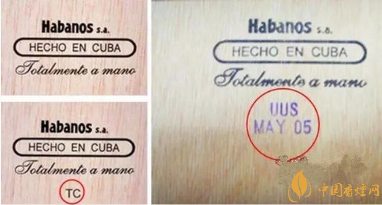 細(xì)心的你還會(huì)注意到在紙盒或木盒的底部,有一個(gè)郵戳一樣的東西。這個(gè)簡(jiǎn)易的郵戳是這盒雪茄的工廠代碼和生產(chǎn)日期,UUS是工廠代碼,MAY 05 則表示是2005年5月。