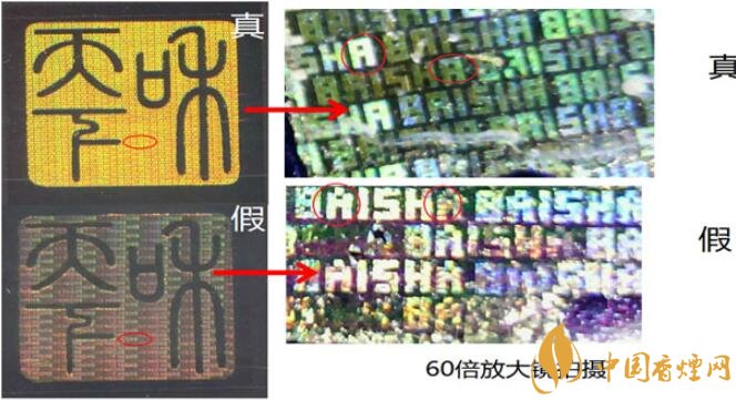 (1)用15倍放大鏡觀(guān)察,真煙底部采用全息防偽,“BAISHA”微縮字字體較小,隱隱約約能看清;假煙底部“BAISHA”微縮字字體要清晰一些,但是“A”頂部是尖銳的;