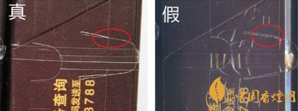 真品卷煙小盒拉帶變換角度會(huì)看到圖示的麻點(diǎn),有點(diǎn)狀感;假煙沒(méi)有麻點(diǎn)或者麻點(diǎn)沒(méi)有點(diǎn)狀感。