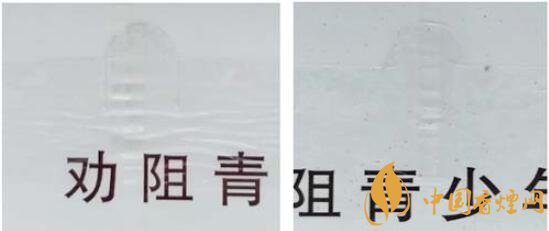 (2)真品卷煙商標(biāo)印刷采用凹印,色彩交界邊緣呈現(xiàn)鋸齒狀;該款假冒卷煙商標(biāo)印刷采用膠印色彩交界邊緣光滑。(圖2左真右假)