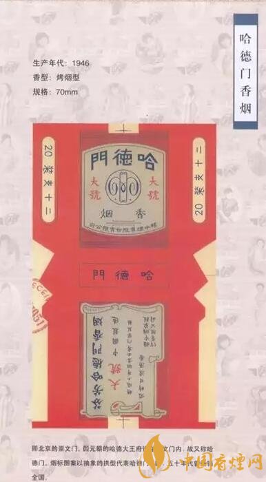 作為早期的洋煙商標(biāo)之一,“哈德門(mén)”商標(biāo)是當(dāng)時(shí)大英煙草公司于1919年注冊(cè)的。后來(lái)通過(guò)英美煙草公司在中國(guó)建廠制造,“哈德門(mén)”成為二十世紀(jì)二三十年代家喻戶(hù)曉的著名香煙品牌。由于煙標(biāo)構(gòu)思新穎,色調(diào)幽雅清新,吸食甘涼清香,因此很受煙民的歡迎。