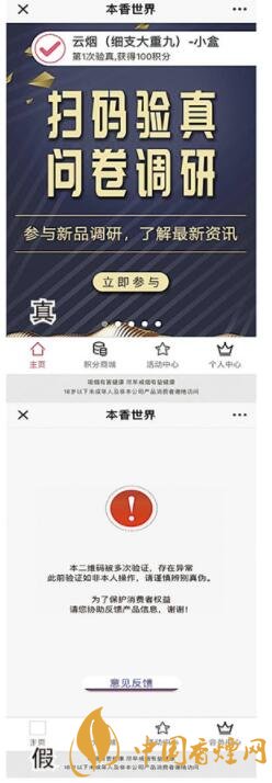 掃描二維碼后輸入煙盒內(nèi)6位驗證碼,真煙顯示“第1次驗真”;假煙顯示“本維碼被多次驗證,存在異常”。