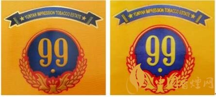 真品卷煙:1.商標(biāo)LOGO稻穗圖案凸起,整體立體、飽滿(mǎn),大豐收。2.99數(shù)字筆畫(huà)圓潤(rùn)、飽滿(mǎn),下面圓點(diǎn)尤為突出。3. 藍(lán)色底紋顏色重,邊緣向中間色彩過(guò)渡自然。4.商標(biāo)紙流水紋路清晰可見(jiàn)。